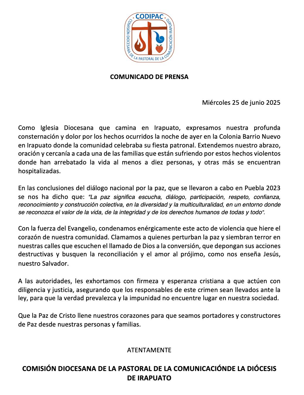 «Cono iglesia Diocesana que camina en Irapuato, expresamos nuestra profunda consternación y dolor por los hechos ocurridos la noche de ayer en la colonia Barrio Nuevo en Irapuato, donde la comunidad celebraba su fiesta patronal. Extendemos nuestro abrazo, oración y cercanía a cada una de las familias que están sufriendo por estos hechos violentos, donde han arrebatado la vida al menos a diez personas y otras más se encuentran hospitalizadas».