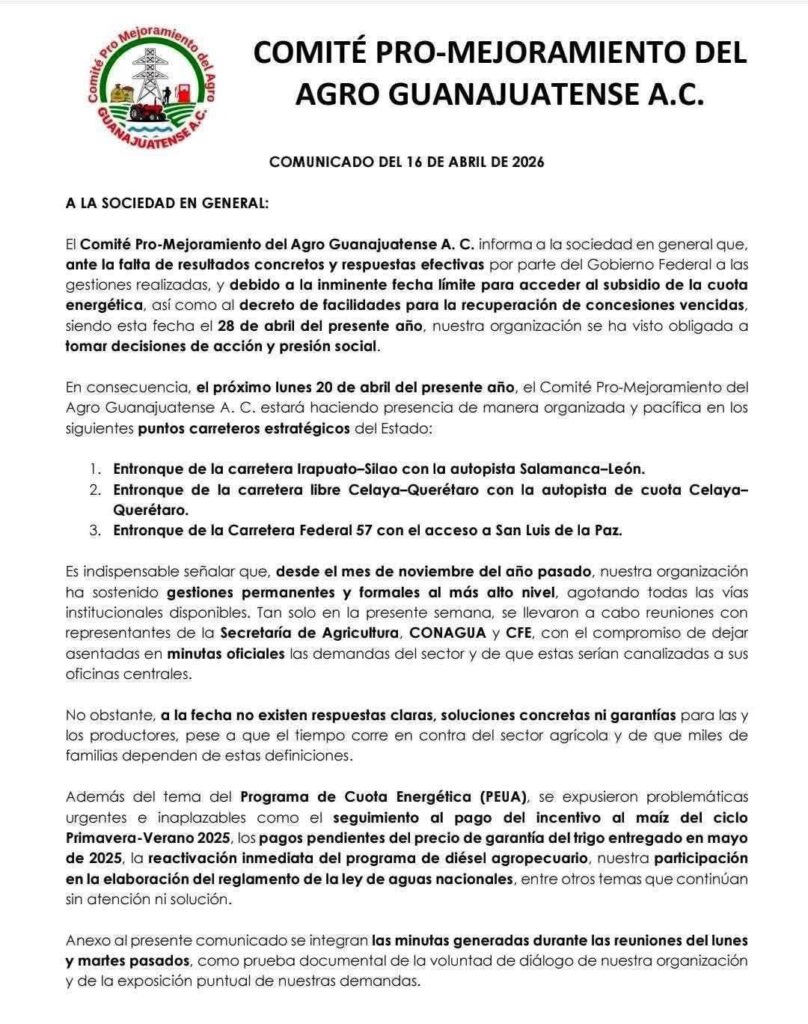 Irapuato, Gto. (Opinión Bajío).- El comité Pro-Mejoramiento del Agro Guanajuatense, anunció la posibilidad de protestas en puntos carreteros el próximo 20 de abril de 2026, derivado de falta de solución a varias problemáticas por parte del gobierno federal.