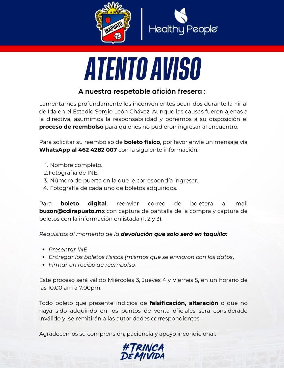 Para solicitar el reembolso del boleto físico, se debe enviar un mensaje de whatsapp al teléfono 462 4282 007, con su nombre completo, fotografía de la credencial del INE, número de puerta donde se iba a ingresar y foto de los boletos adquiridos.
