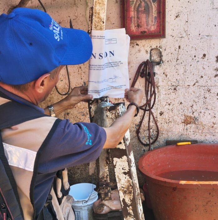 Pénjamo, Gto. (Opinión Bajío).- La Secretaría de Salud de Guanajuato, a través de la Dirección General de Protección contra Riesgos Sanitarios (DGPRIS), informa que se aplicó la suspensión total temporal de trabajos y servicios a un matadero particular ubicado en la colonia San Miguel, en el municipio de Pénjamo.