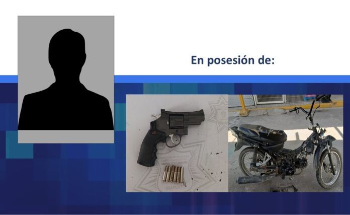 Para prevenir la comisión de probables delitos y enterar de las faltas a las que incurrían, los elementos abordaron a los tripulantes del vehículo de motor, a quienes les practicaron una revisión preventiva, mediante la cual encontraron entre las pertenencias del menor de 15 años un arma de fuego tipo revolver, color negro, al parecer de uso deportivo.