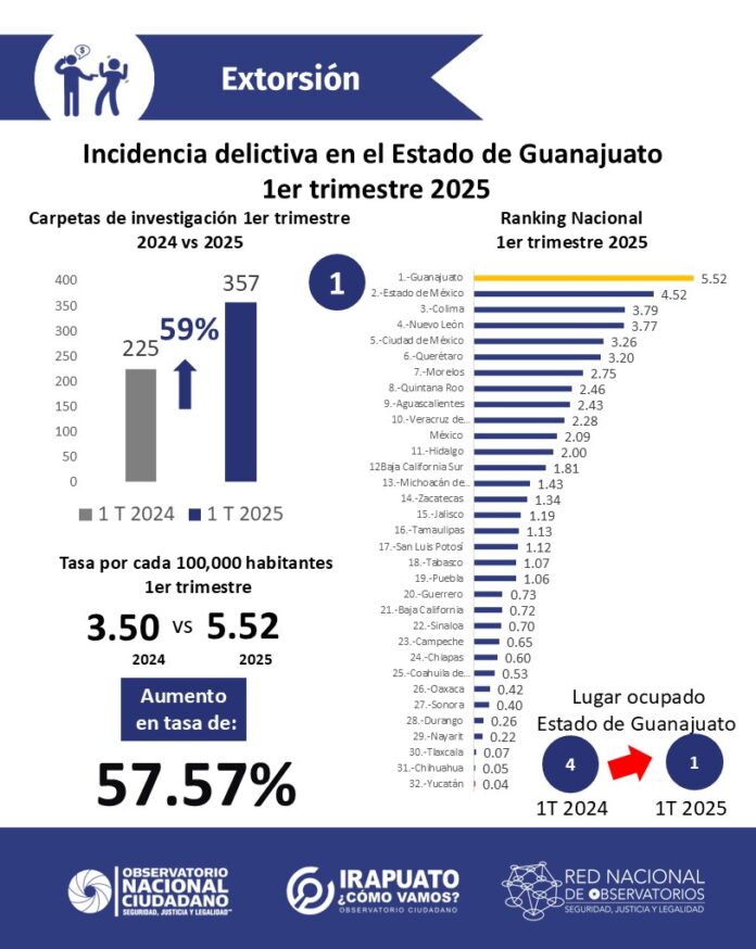 Irapuato, Gto. (Opinión Bajío).- Delitos como el homicidio, el feminicidio y la extorsión registraron un incremento considerable en el primer trimestre del año 2025, de acuerdo al Observatorio ciudadano «Irapuato ¿Cómo vamos?», al presentar el reporte de incidencia delictiva de los 16 delitos de alto impacto registrados en el estado de Guanajuato y el municipio de Irapuato.