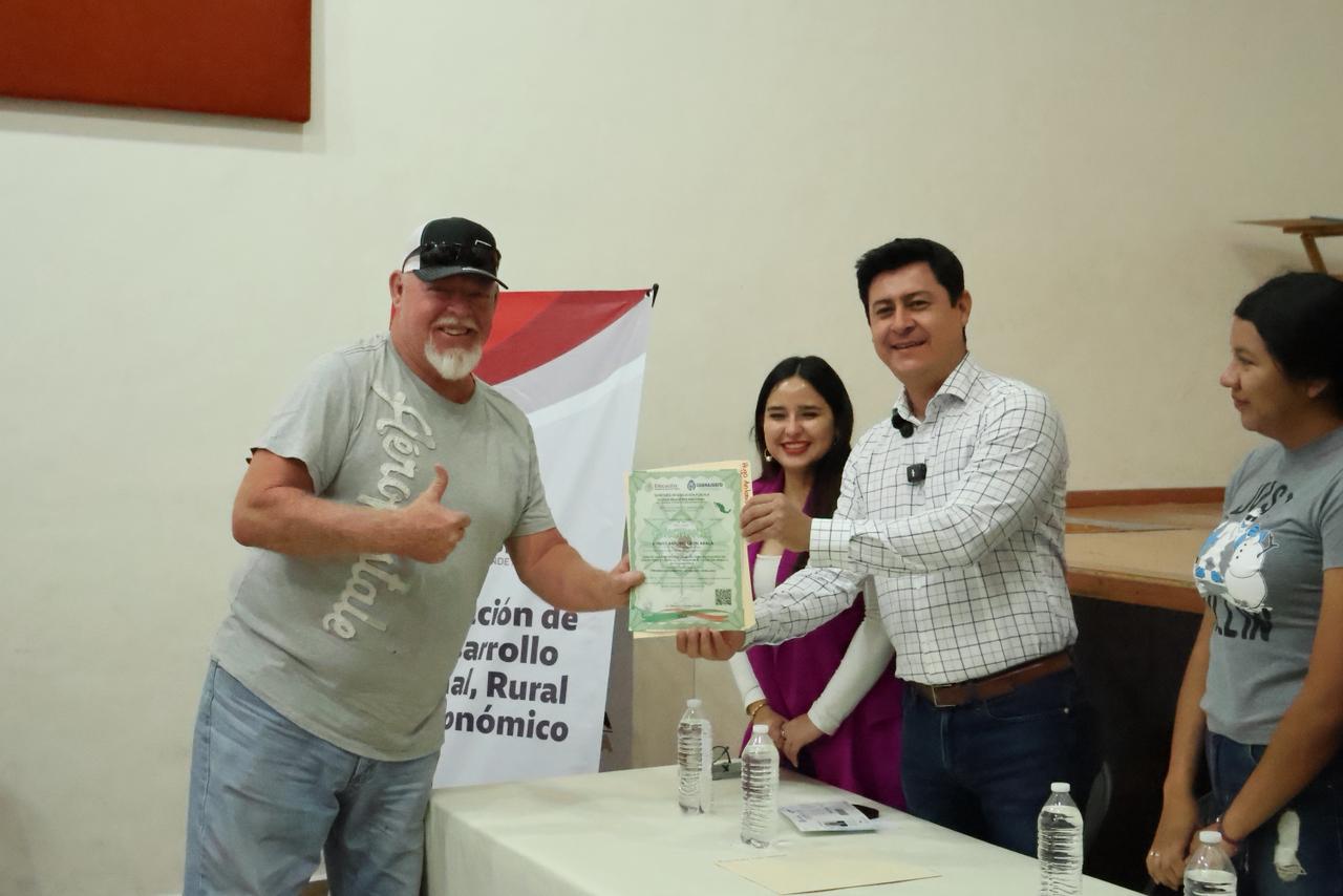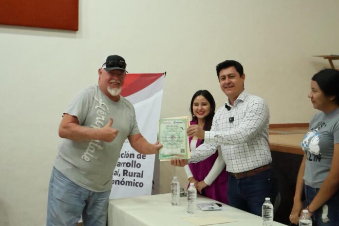 Con la participación del Presidente Municipal, de la Jefa de Vinculación del Instituto Estatal de Capacitación (IECA), Dana Guadalupe Palomino Castañeda; así como con Rosa María Lara, en representación de los beneficiarios; y el director de Desarrollo Social, Rural y Económico, Marco Aurelio Estrada, se dio paso a la entrega de las constancias y tarjetones.