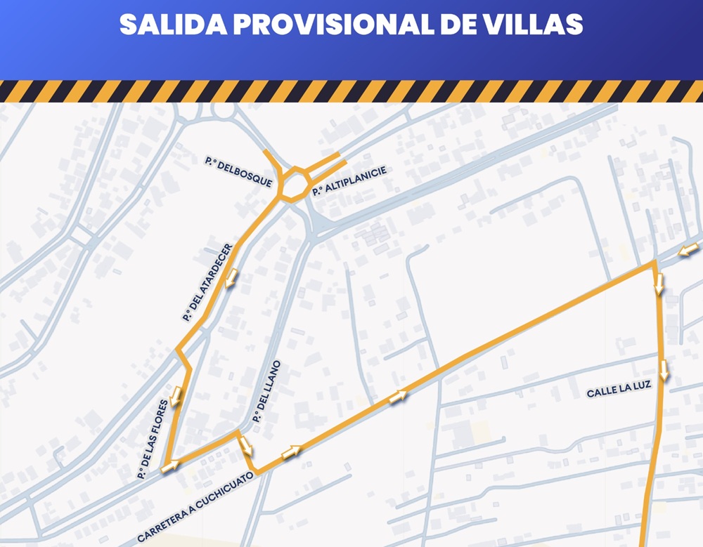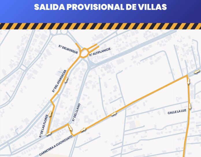 Ante esta situación, se ha habilitado una salida alterna provisional con el objetivo de agilizar la movilidad y reducir la carga vehicular en la zona. Esta nueva vía se ubica en el lote 110, manzana 18, sobre la calle Paseo del Llano, y conecta con la carretera a Cuchicuato aproximadamente 600 metros adelante de la calle La Luz, ruta que ha funcionado como alternativa durante el desarrollo de la obra.