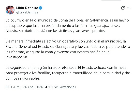 «Lo ocurrido en la comunidad de Loma de Flores, en Salamanca, es un hecho inaceptable que lastima profundamente a las familias guanajuatenses. Nuestra solidaridad está con las víctimas y sus seres queridos. De manera inmediata se activó un operativo conjunto con el municipio, la Fiscalía General del Estado de Guanajuato y fuerzas federales para atender a las víctimas, asegurar la zona y avanzar con determinación en la investigación. La seguridad en la región ha sido reforzada. El Estado actuará con firmeza para proteger a las familias, recuperar la tranquilidad de la comunidad y dar con los responsables», indicó la gobernadora Libia Dennise en sus redes sociales.