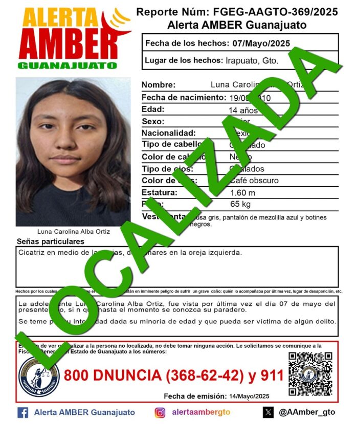Por la mañana, trascendió en redes sociales que familiares de la jovencita -plagiada en una tienda de abarrotes en la calle Pedro Moreno- anunciaban que ya estaba con su familia; luego, la alerta amber que se tenía con su ficha fue desactivada por haber sido localizada con vida.