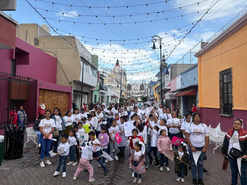 Las niñas y niños portaron playeras blancas y letreros con leyendas como: “Por un mundo lleno de amor”, “Queremos paz” y “Paz en el mundo”, mismas que elaboraron con ayuda de sus papás y que portaron durante todo su recorrido por las calles Revolución, Obregón, Juárez hasta la Plaza Cívica Miguel Hidalgo.