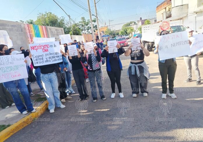Irapuato, Gto. (Opinión Bajío).- Estudiantes de la Escuela Normal Oficial de Irapuato (ENOI) se manifestaron para expresar su inconformidad con sanciones aplicadas a un maestro por presuntamente haber reprobado a un alumno cercano al director del plantel.