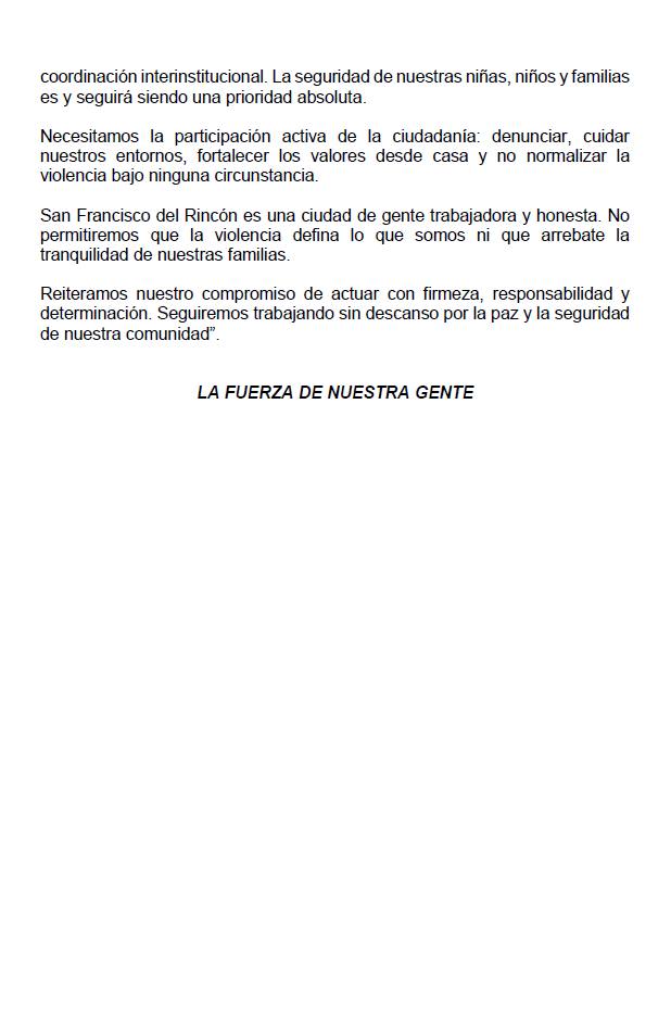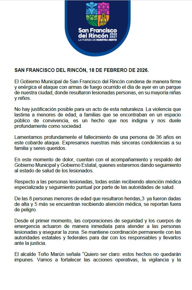 «Condeno profundamente lo ocurrido anoche en San Francisco del Rincón, donde niñas, niños y adolescentes resultaron heridos en un hecho absolutamente inaceptable. Desde el primer momento instruí a las áreas de seguridad @pazgobgente y salud @saludgobgente para brindar atención médica inmediata, así como acompañamiento integral a las familias afectadas».