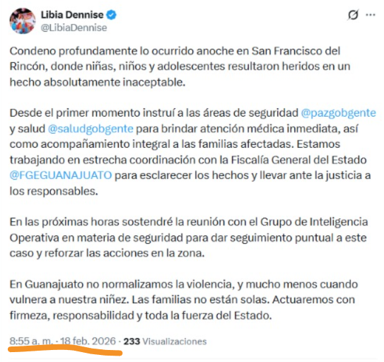 «Estamos trabajando en estrecha coordinación con la Fiscalía General del Estado @FGEGUANAJUATO para esclarecer los hechos y llevar ante la justicia a los responsables. En las próximas horas sostendré la reunión con el Grupo de Inteligencia Operativa en materia de seguridad para dar seguimiento puntual a este caso y reforzar las acciones en la zona. En Guanajuato no normalizamos la violencia, y mucho menos cuando vulnera a nuestra niñez. Las familias no están solas. Actuaremos con firmeza, responsabilidad y toda la fuerza del Estado», indicó la gobernadora en el mensaje en redes sociales, publicado hasta las 8:55 de la mañana, casi 12 horas después del atentado.