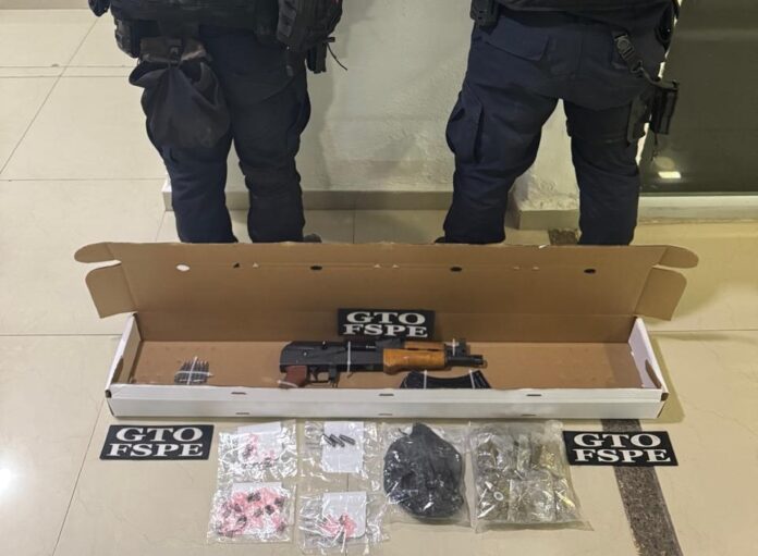 Se aseguraron 1 arma larga, calibre 7.62×39 mm, con cargador metálico y 11 cartuchos útiles; 24 bolsas con hierba verde y seca con las características de la marihuana que equivalen a 210 dosis; 27 bolsas con una sustancia granulada y cristalina, presumiblemente “cristal”, con alrededor de 27 dosis; 1 motocicleta color negro con anaranjado, marca Vento, con reporte de robo del 28 de junio de 2025 en Irapuato; y 1 motocicleta color verde con gris, marca Vento tipo sport, sin placas.